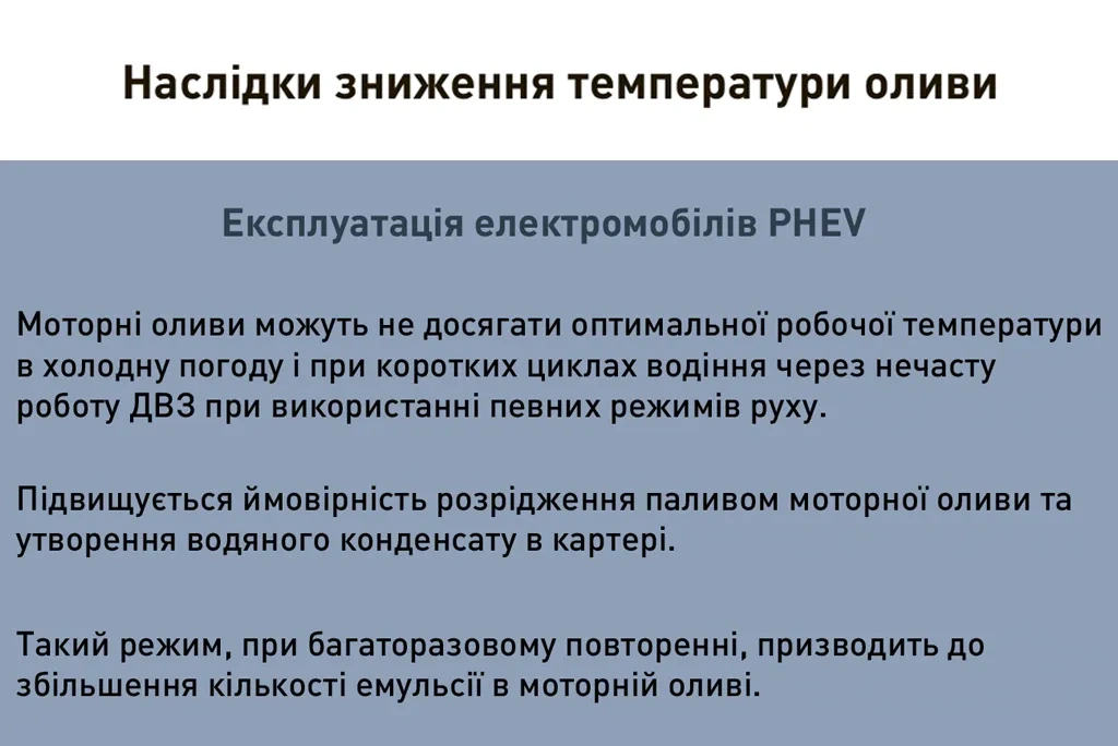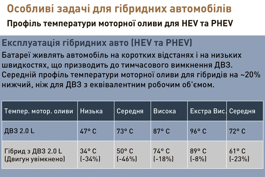 Таким чином, олива для “гібрида” потребує відповідної корекції характеристик для ефективного захисту деталей при зниженій робочій температурі.