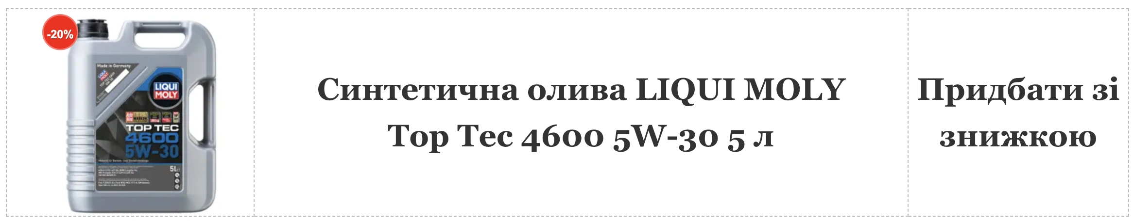 Для українських водіїв компанія LIQUI MOLY підготувала спеціальну пропозицію. З 20 січня по 16 лютого 2025 року діє акція «Флагманська олива для європейських автомобілів». Ви маєте можливість придбати 5-літрову каністру Top Tec 4600 5W-30 зі знижкою 20% у всіх офіційних точках продажу.Не втрачайте можливості забезпечити свій автомобіль найкращою оливою за вигідною ціною. Top Tec 4600 5W-30 — це ваш вибір для максимального захисту двигуна та впевненості на дорогах Європи та України.