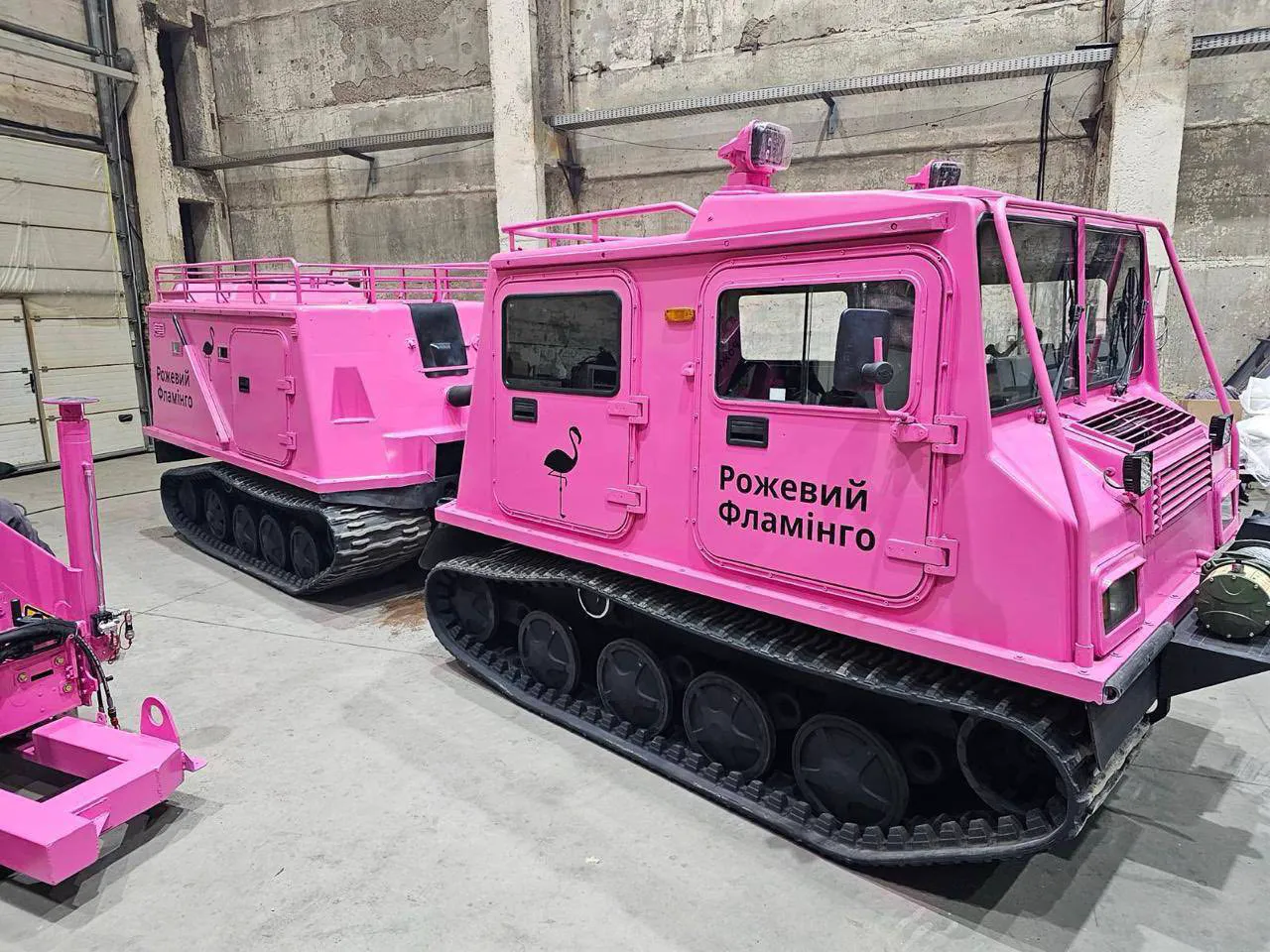 Що ж являє собою «Рожевий фламінго»? Як видно з фото, це гусеничний двосекційний всюдихід Bandvagn 206 від шведського виробника Haegglunds. Такі почали випускатися ще 1980 року і здобули чималу популярність, у тому числі й у військових – є такі й в ЗСУ