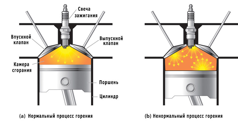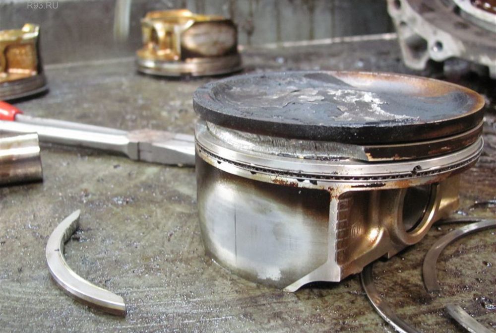Це більш типовий для нашого часу випадок, та й варіантів реакції мотора на нього більше. Низьке октанове число викликає детонацію – вибухоподібне згоряння пального у циліндрі, через що деталі мотора зазнають надмірних навантажень. Ударна хвиля ламає перегородки між кільцями на поршнях, перегріває і трощить тарілки клапанів та свічки. У найбільш невезучих водіїв в моторах можуть попутно вигоріти прокладка головки блоку и постраждати шатунні вкладиші.