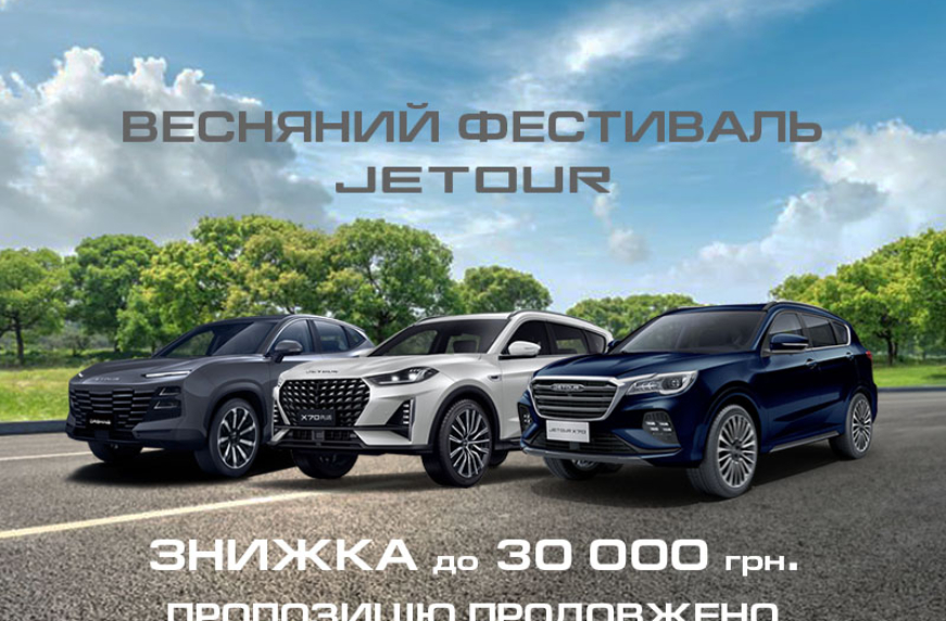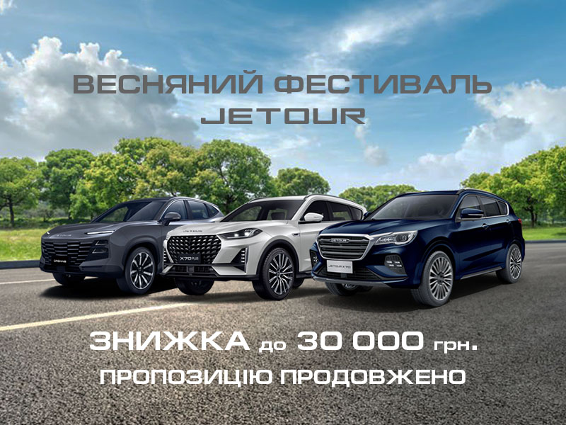Компанія ТОВ «АВТО МОТОР ГРУП», офіційний дистриб’ютор бренду JETOUR в Україні продовжує дію пропозиції ВЕСНЯНИЙ ФЕСТИВАЛЬ JETOUR: ЗНИЖКИ ДО 30 000 грн* та можливість придбати автомобілі JETOUR за спеціальною роздрібною ціною, зі знижкою**.