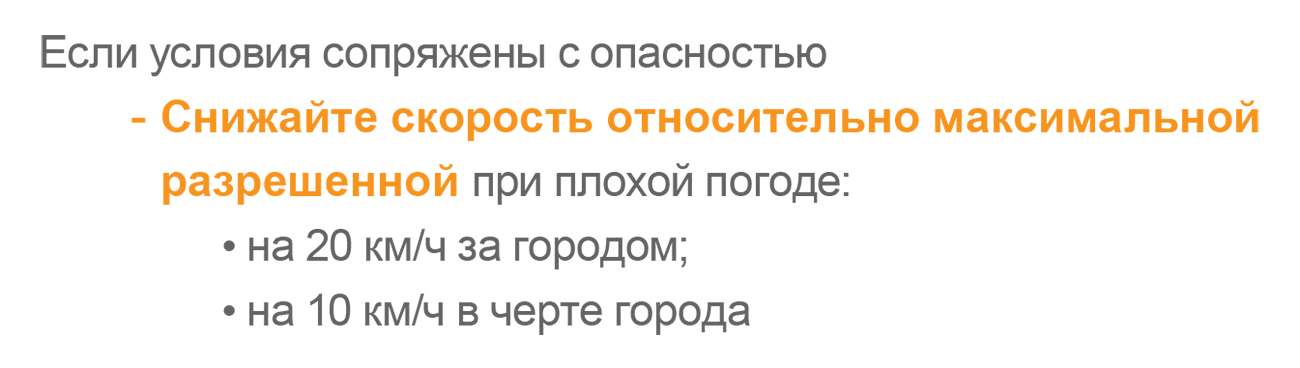 Умение менять и адаптировать стиль вождения к меняющимся условиям. Часто можно наблюдать, как с началом ливня или снегопада некоторые водители продолжают нестись с той же скоростью. А по рекомендациям Total скорость необходимо снизить, а дистанцию до впередиидущего автомобиля – увеличить.