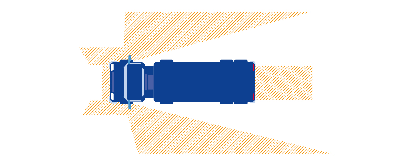 Внимание к слепым зонам, что в первую очередь актуально для водителей автопоездов. И хотя автопроизводители стремятся минимизировать «невидимые» участки вокруг автомобиля, устанавливая панорамные зеркала, парктроники, камеры, все равно невидимые зоны остаются. О них важно помнить и водителям легковых автомобилей, которые часто норовят проскочить и «спрятаться» там, где водитель «фуры» их может не заметить. На фото ниже наглядная иллюстрация того, где у грузовиков эти самые «слепые зоны».