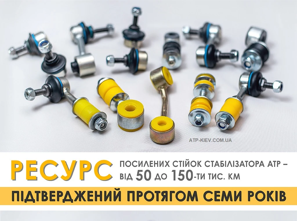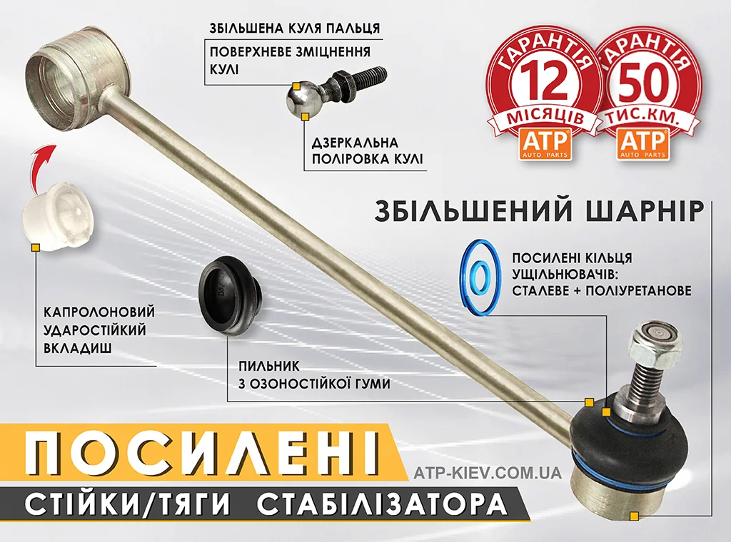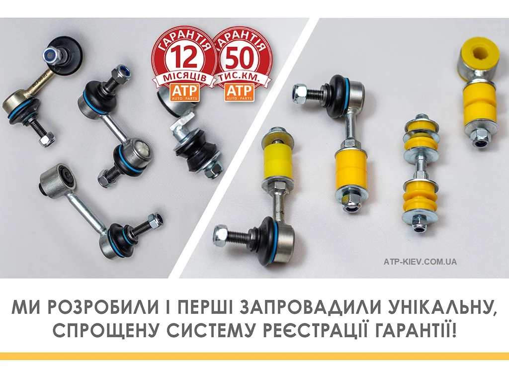 Стійки / тяги стабілізатора поперечної стійкості у вітчизняних умовах традиційно вважаються витратними деталями. Через якість шляхів навіть деякі автовиробники виключають їх зі списку вузлів, які покриваються заводською гарантією на новий автомобіль. А якщо мова йде про сучасність, коли наш ринок автозапчастин «перевантажений» підробками, багато власників машин міняють ці деталі під час регламентного техобслуговування, тобто при кожній заміні мастила у двигуні автомобіля. Але це вже не є проблемою, тому що конструктори і технологи вітчизняної компанії ATP змогли зробити ці деталі підвіски підсиленими, зі значно більшим ресурсом. І це підтверджено небаченою для України гарантією на стійки стабілізатора торгової марки ATP auto parts.