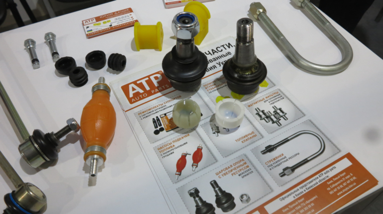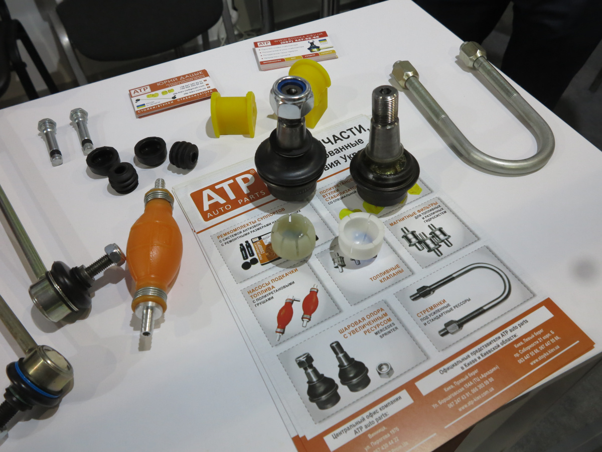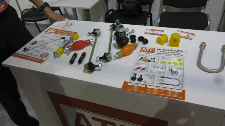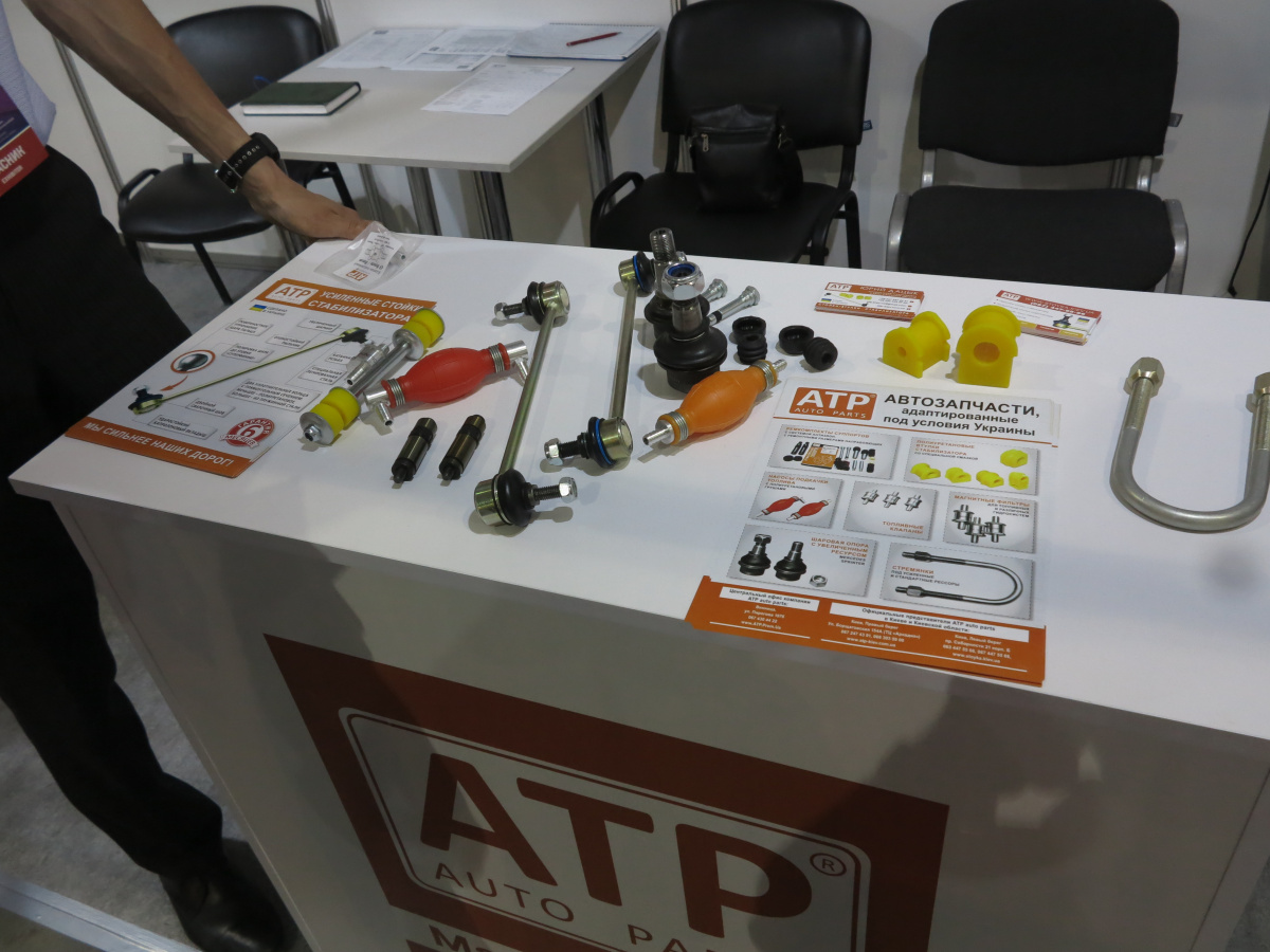На выставке «АвтоТехСервис 2019» стоит отметить украинского производителя запчастей ATP Auto Parts. Основной флагман ассортимента – усиленные шарнирные стойки стабилизатора. Главные отличия от обычных стоек – увеличенный шарнир и капролоновый вкладыш, который более ударостойкий и упругий, по сравнению с обычным жестким вкладышем, который обычно идет в импортных стойках. Для Европы с ее ровными дорогами жесткий пластик это нормально, а на украинских дорогах больше подходит упругий пластик.