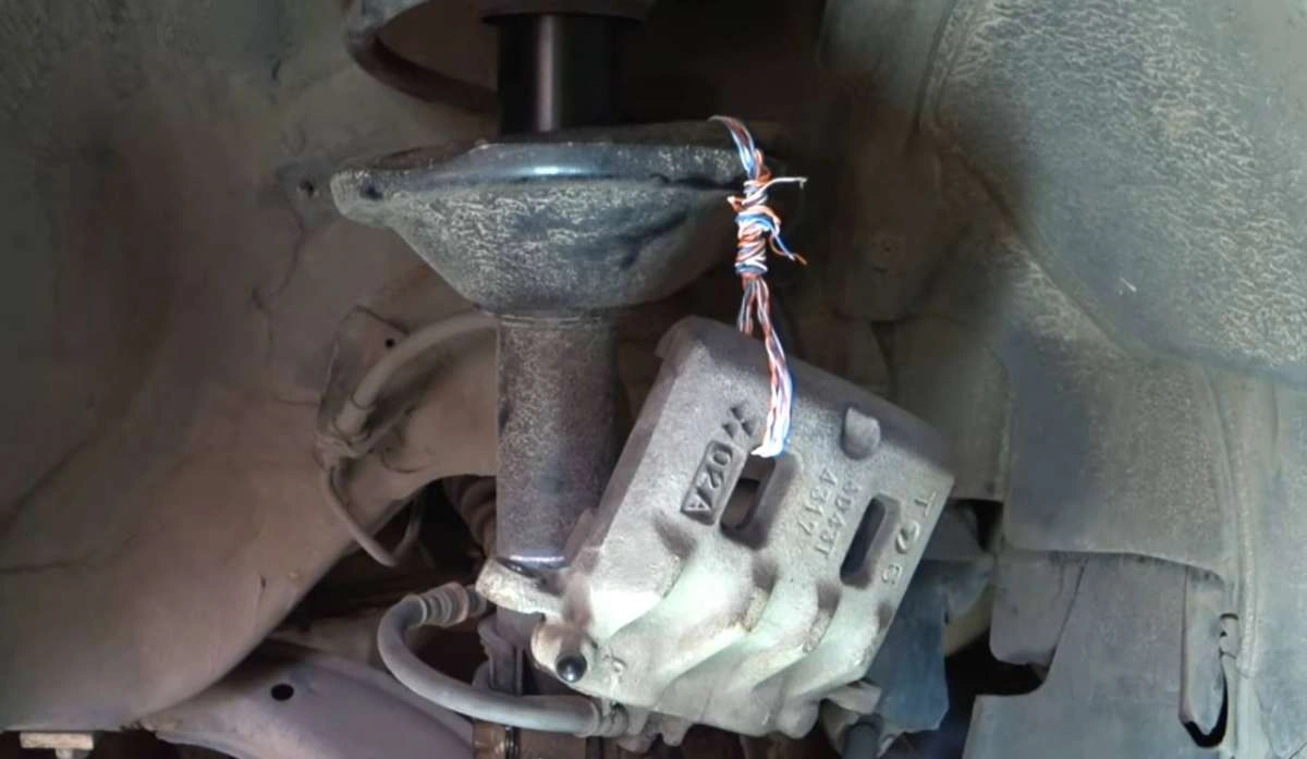 Увага! Закріпіть супорт підручними матеріалами, наприклад дротом або ременем, до деталей підвіски. Це запобігатиме пошкодженню гальмівних шлангів.