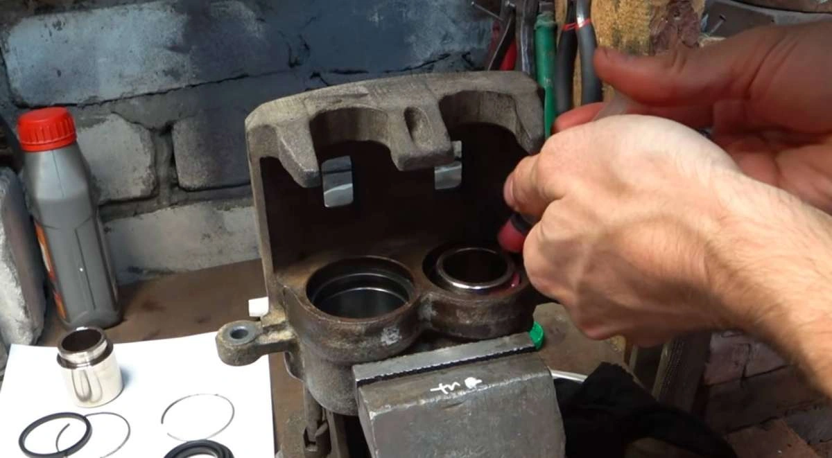 9. Покрийте мастилом периметр поршня. Встановіть супорт на місце. Дійте обережно, щоб не пошкодити напрямні супорта.