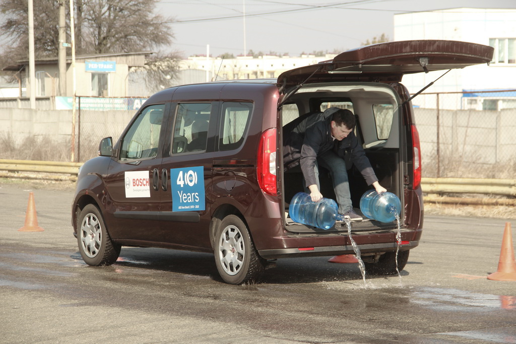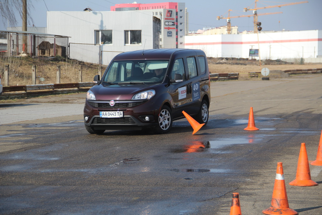 В качестве подопытного выступает наш редакционный Fiat Doblo снаряженной массой 1300 кг. Он обут в новую фрикционную зимнюю резину. На каждом из трех типов покрытий мы будем выполнять экстренное торможение сначала по прямой, а затем с имитацией объезда препятствия. Для наглядности вдоль контрольной дистанции мы расставили конусы на расстоянии 2,5 метра друг от друга. Все упражнения будут выполняться по 3 раза. Скорость начала торможения – 60 км/ч.