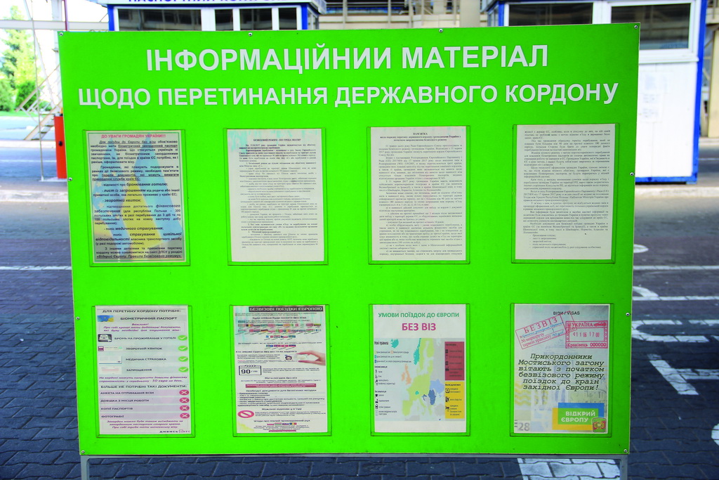Места таможенного оформления при пересечении границы Украины обозначены цветами и соответствующими надписями «Зелений коридор» (Green channel) и «Червоний коридор» (Red channel).