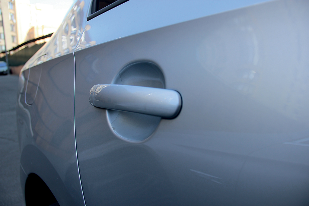 Заглиблення під зовнішніми ручками дверцят – ще одне місце, де кузову гарантовані численні подряпини. Причому у багатьох автомобілів ці ніші страждають не тільки від довгих жіночих нігтів, а й від усіх користувачів без розбору. Наш Rapid може сміливо хвалитися збереженням своїх дверцят – тут плівка теж відпрацювала на п’ять балів.