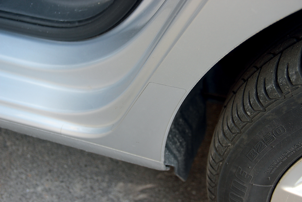Що є, то є: пороги дверцят ми даремно не обклеїли плівкою. З водійської сторони сьогодні маємо легкі, але помітні подряпини – мабуть, підошви чийогось взуття були надмірно жорсткими. А що було б, якби ми багато і часто возили жінок на гострих підборах-шпильках? Зате про збереження нижньої частини задніх колісних арок за нас подумав автовиробник: ця вразлива зона попереду заднього колеса на нашій Skoda була обклеєна полімерною плівкою з заводу! І не даремно: з правого боку на ній сьогодні є помітні горизонтальні подряпини. Але фарба, звісно, не постраждала. Ну вже якщо європейський автовиробник використовує захисні плівки, то і ми з нашою плівковою ініціативою стали на вірний шлях. Власне, це підтверджують і виявлені нами відмітини – на плівці, але не на кузові!