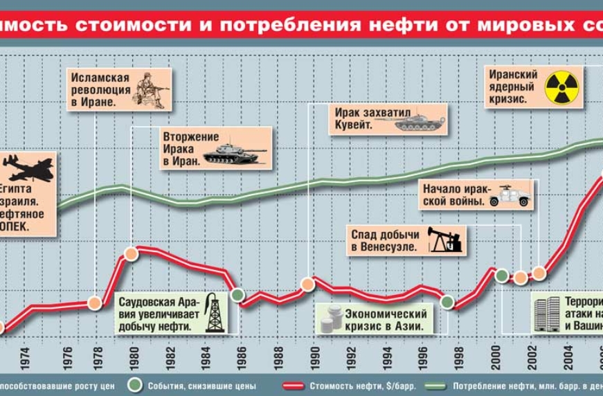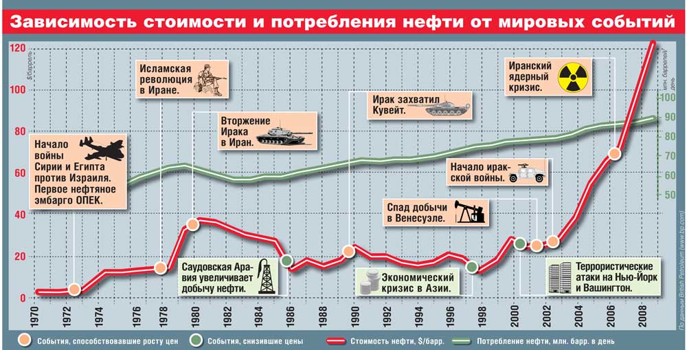 Динамика изменений цен на нефть за последние 5 лет очень напоминает нефтяной кризис тридцатипятилетней давности. Причиной роста цен в 1973 году также стало начало войны на Ближнем Востоке. Арабские страны-экспортеры запретили вывоз нефти в государства, поддержавшие Израиль в войне против Египта и Сирии. Далее была иранская революция 1979-го, ирано-иракская война – и цены выросли более чем в два раза. Крупнейшие страны-экспортеры, входящие в ОПЕК, сокращая добычу «черного золота», добились его дефицита и, соответственно, увеличения стоимости.