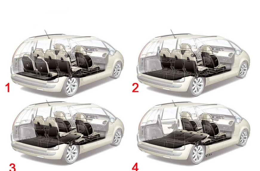 В большинстве случаев эти три параметра относятся к семиместным минивенам. Для Citroёn Grand C4 Picasso указаны размеры 208/672/1951. Первое число – объем багажника в походном состоянии, со всеми разложенными сиденьями (1). При сложенной «галерке» объем увеличивается до 672 литров (2), а если превратить автомобиль в двухместный (4), то в распоряжении ездоков внушительные 1951 л. Иногда тройную характеристику применяют для пятиместных минивенов. Тогда первое число – это походное состояние, но при загрузке до полки багажника, второе – до потолка. Третий параметр соответствует сложенному заднему ряду. У минивенов легко трансформируемые салоны, в которых можно сложить (3) или убрать одно из сидений любого ряда, но в технических характеристиках такие комбинации не описываются.