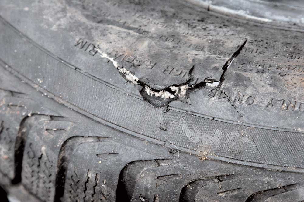 Производители шин не рекомендуют ремонтировать боковые порезы. Мы провели эксперимент. У одного из поставщиков материалов для шиноремонта взяли набор заплат разных размеров и разной толщины, а также клей, используемый шиномонтажниками. На трассе прорезали боковину шины с помощью ножа. Далее повернули колесо так, чтобы порез был сверху, насколько это возможно в дорожных условиях, зачистили зону вокруг пореза наждачной бумагой и нанесли клей. Когда он подсох (минут через 15), прижали заплату (для ремонта порезов боковины изнутри шины) и попытались раскатать ее так, чтобы обеспечить максимальный контакт по всей поверхности соприкосновения. Подождали полчаса и накачали колесо. Нам это удалось, но давление в шине продержалось лишь около километра. Не помогла и повторная попытка с закачкой до более низкого давления (на 30% ниже). Бессильны оказались и велосипедные ремкомплекты. Вывод – такие заплаты эффективны лишь внутри покрышки, где, помимо клея, их прижимает давление воздуха, а края при деформации боковины остаются прижатыми к ней. Во избежание повреждения шин лучше соблюдать правила предосторожности: поддерживать рабочее давление, на плохих дорогах снижать скорость до безопасных пределов, а ночью она должна соответствовать видимости и времени реакции в зоне действия фар.