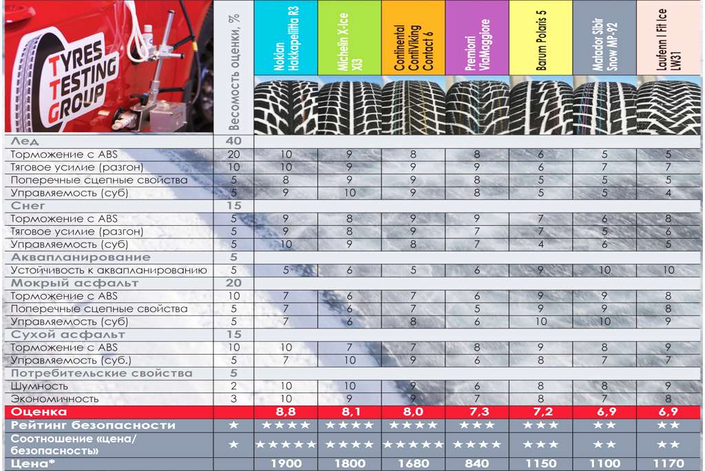 Традиційно тести шин робили на чотирьох актуальних для нашої зими покриттях – лід, сніг, мокрий і сухий асфальт. Найбільшу вагомість мали характеристики на льоду, як на найнебезпечнішому дорожньому покритті. Також актуальними були гальмівні властивості на асфальті.