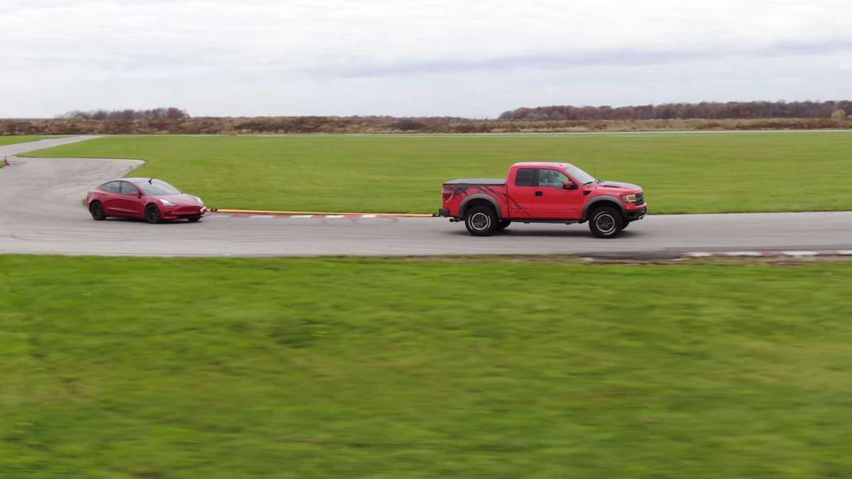 Відеоролик із незвичайним експериментом з’явився на Youtube-каналі Engineering Explained. Щоб зарядити електромобіль Tesla Model 3, його взяв на буксир потужний пікап Ford F-150 Raptor.