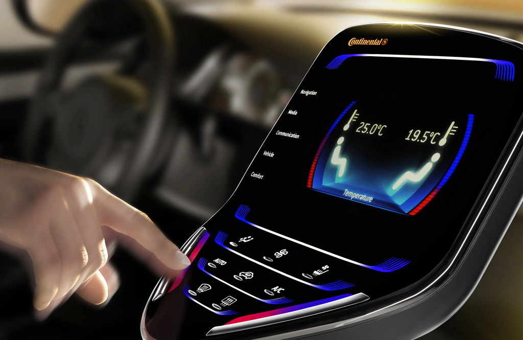На выставке в Лас-Вегасе компания Continental продемонстрировала систему автомобильного touch-screen. До последнего времени сенсорные дисплеи в автомобилях не могли обеспечить должной надежности использования для водителей. Ведь безопасно управлять электроникой за рулем можно только «на ощупь», не отрывая взгляда от дороги. Инженеры Continental планируют исправить это, усовершенствуя технологию touch-screen. Чтобы управлять системами, органы управления которых выведены на центральную консоль, они сделали поверхность экрана эластичной.