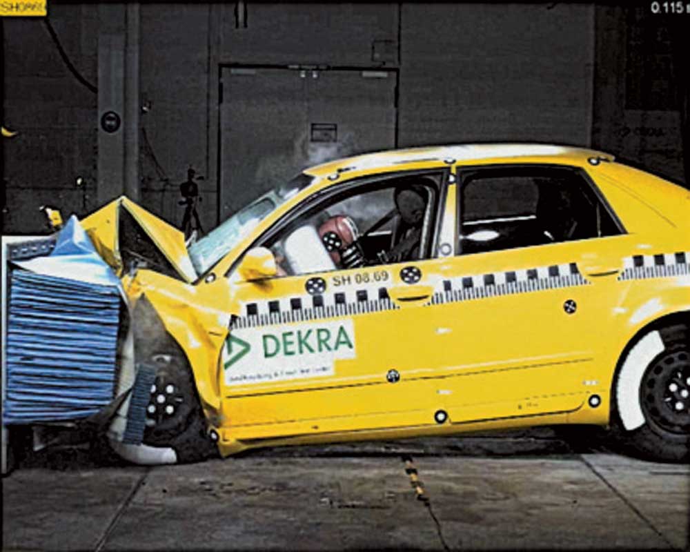 Первый тест проходил на мокрой трассе. Оценивался тормозной путь машин при торможении со скорости 80 км/ч до полной остановки. У автомобиля с дешевыми шинами он оказался 52 м против 39 м – у машины с премиум-резиной. Соответственно, в момент предполагаемого столкновения с условным препятствием скорость первого составила бы 69 км/ч, а второго – 58 км/ч. Если бы на этой 13-метровой дистанции-разнице находился пешеход или другой участник дорожного движения на легком транспорте (мотоцикл, велосипед), для него ДТП могло бы закончиться даже летальным исходом. А если бы препятствие было в виде автомобиля или какого-нибудь другого неподвижного барьера? Последствия такого ДТП сымитировали в ходе проведения фронтальных краш-тестов. Эти же тест-машины разбили с 40-процентным перекрытием о неподвижное препятствие на экспериментально полученных скоростях, т. е. на 69 и 58 км/ч соответственно. Естественно, что при подобном ударе автомобиль, шедший на большей скорости, был поврежден гораздо сильнее (см. фото). Более того, водитель в этом случае получил бы серьезные травмы брюшной полости и костей таза, что могло бы привести к разрыву внутренних органов – селезенки и печени. Проблемы возникли бы также из-за сильной деформации кузова, повлекшей заклинивание водительской двери. В реальной жизни подобные обстоятельства могут привести даже к смерти водителя.
