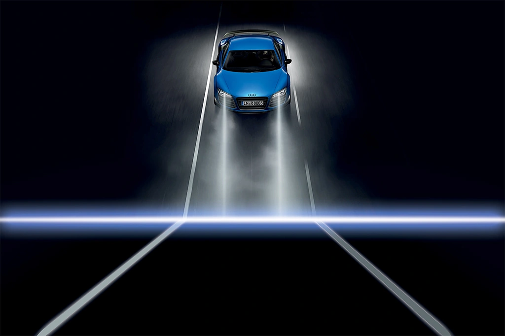 Активно работает над внедрением лазерных фар в свои модели и компания Audi. Первенцами стали Audi R18 e-tron quattro и концептуальный Audi Sport quattro Laserlight. Причем R18 e-tron quattro уже нынешним летом поступит в продажу в Германии по цене 210000 евро. Особенность фар этого автомобиля – их лазерные модули активизируются при скорости 60 км/ч и выше. Ниже этой границы дорогу освещают обычные светодиоды. Каждая лазерная фара R18 e-tron quattro включает четыре мощных лазерных диода. Диаметр их тела свечения – 300 микрометров. Диоды генерируют синий луч с длиной волны 450 нм. В специальном флуоресцентном преобразователе синий свет становится белым с цветовой температурой 5500 Кельвинов. Этот свет обеспечивает минимальную усталость глаз. Дальность лазерного луча – 500 метров.
