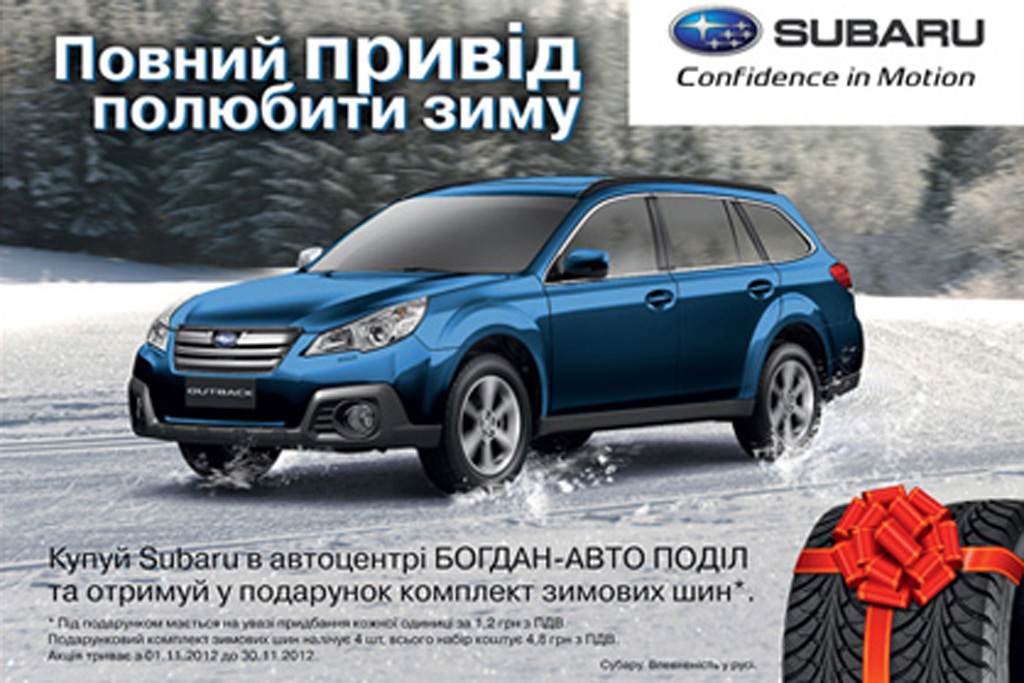 С 16 октября по 30 ноября 2012 года каждый покупатель получает возможность воспользоваться акционным предложением: покупая новый автомобиль Subaru любой модели, Вы можете приобрести комплект зимней резины в количестве 4 автомобильных шин по цене 1 грн. 20 коп. за 1 шину (итого за комплект – 4 грн. 80 коп.).