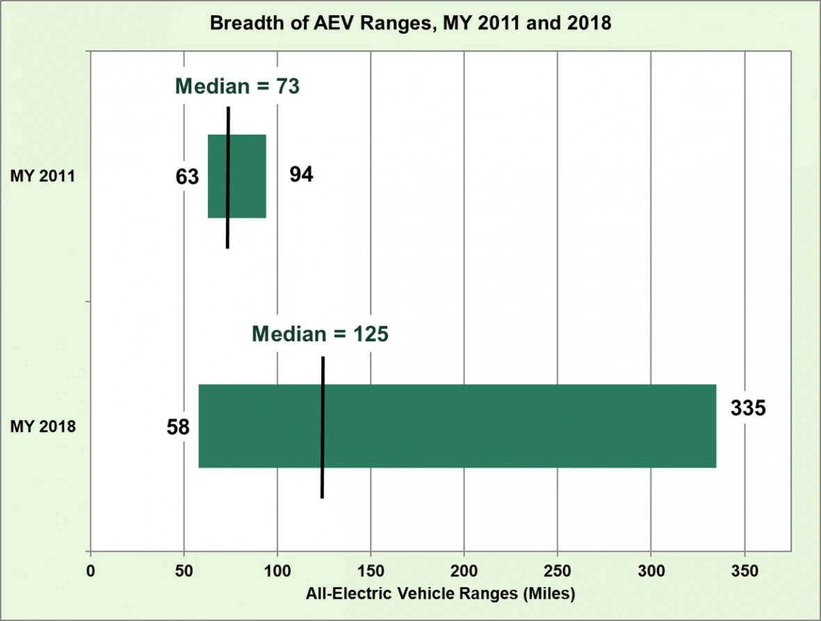 По данным Управления по охране окружающей среды (EPA) США, за прошедший 2018 год средний запас хода для электромобилей достиг 200 км (125 миль). Это превысило прошлогоднюю цифру приблизительно на 10%, когда в 2017 году среднее число составляло 182 км.