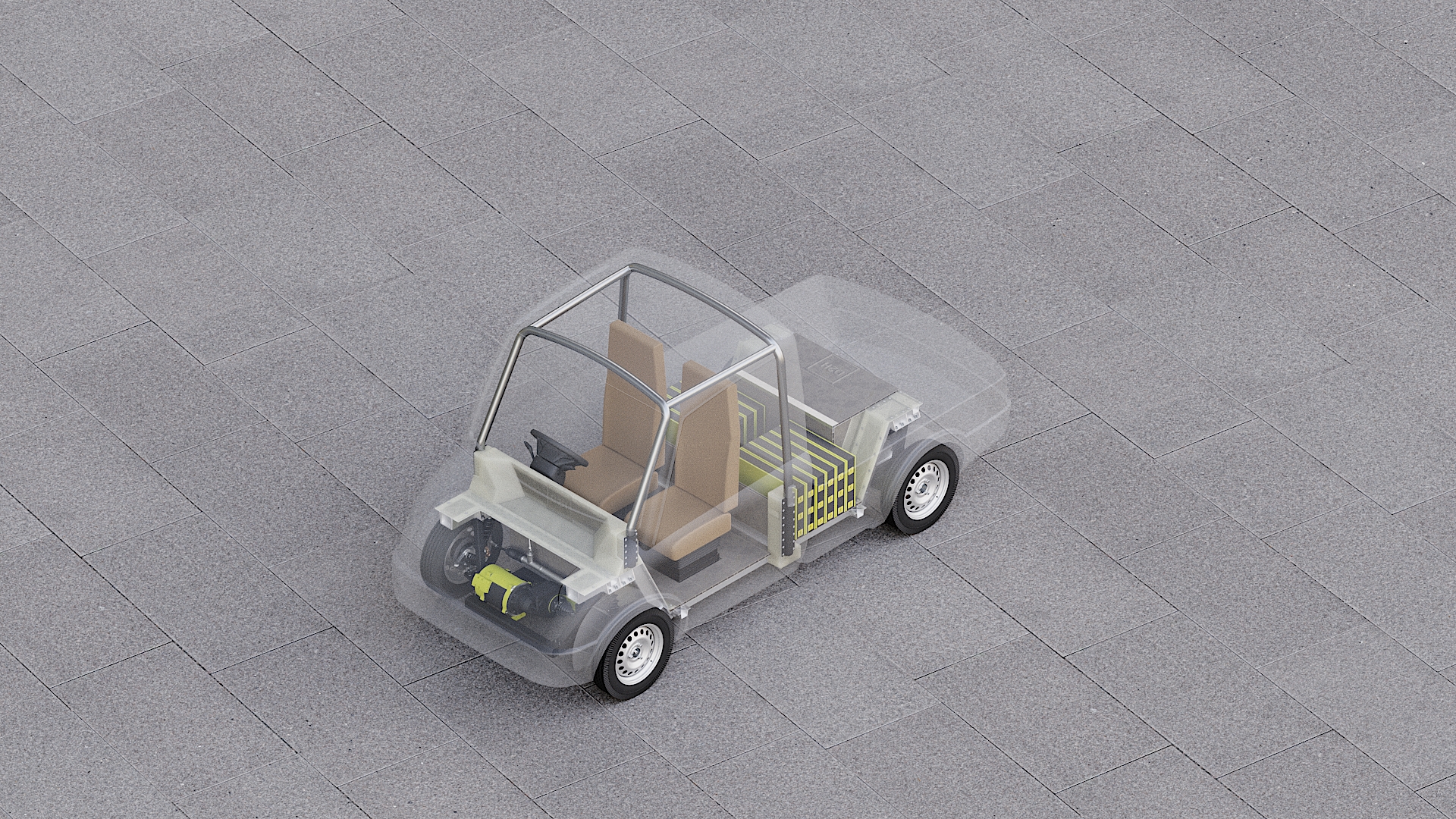 Транспортное средство, пока еще находящееся на стадии проектирования, будет весить около 480 кг и сможет работать на одной зарядке до 12 часов. Шасси с передним приводом будет приводиться в движение двигателем с передним расположением с батарейными пакетами, расположенными либо в базе, либо между задними колесами, в зависимости от конфигурации.