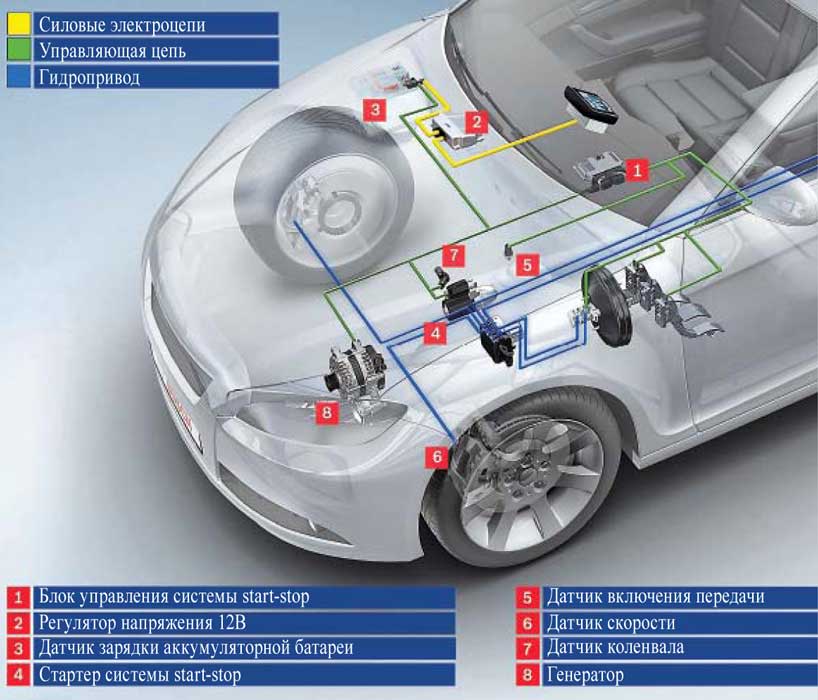 В отличие от start-stop, работающей в паре с ручной КП, в тандеме с «автоматом» система будет активизироваться, т. е. выключать мотор, после нажатия и отпускания педали тормоза. Запускался же мотор в машинах с «механикой» после нажатия педали сцепления и включения передачи. Чтобы эта функция реализовалась в автомобилях с «автоматом», они будут оснащаться мощным малошумным электромотором и более мощным аккумулятором с датчиком степени зарядки. При большом разряде система start-stop не будет активироваться.