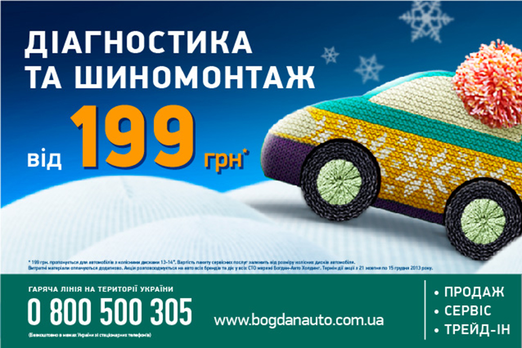 В рамках акции, с 21 октября по 15 декабря 2013 года, все клиенты сервисных центров «Богдан-Авто Холдинг» смогут выгодно продиагностировать свое авто и «переобуть» его на зимнюю резину с ощутимой экономией.