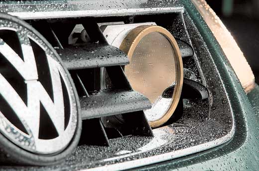 После того как электроника научилась при необходимости самостоятельно управлять двигателем и тормозной системой, автомобильные инженеры решили заставить ее работать в паре с круиз-контролем. В результате в начале этого столетия в серийных машинах появился адаптивный круиз-контроль (adaptive cruise control – АСС, automatic distance control systems – АDС, Distronic), который способен не только автоматически поддерживать заданную водителем скорость движения, но и дистанцию, даже тормозить при приближении препятствия. Для этого интеллектуальную электронику современного автомобиля вооружили микроволновым датчиком-радаром, излучающим волны миллиметрового диапазона. Подобные радары устанавливаются на военных вертолетах Apache для повышения точности ведения огня по целям. В автомобиле датчик-радар монтируют, как правило, в передний бампер (1) или за декоративную решетку радиатора (2). Принцип его работы аналогичен принципу парковочных радаров, а отличаются они только характеристиками: датчик-радар АСС имеет большую дальность действия – несколько сотен метров (например, у Audi Q7 – 180 м), но меньший угол охвата – несколько градусов. Послав сигнал, датчик-радар ждет ответа (3). Когда электронные волны находят в опасной близости препятствие, многократно отразившись от него и вернувшись назад, электроника приходит к выводу о том, что скорость необходимо снижать. При этом система самостоятельно уменьшает обороты двигателя. При увеличении дистанции до препятствия или его исчезновении электроника восстанавливает первоначально заданный скоростной режим. Адаптивный круиз-контроль способен поддерживать безопасное расстояние до впереди идущего автомобиля в разных диапазонах скоростей. Если, несмотря на торможение двигателем, дистанция до помехи продолжает сокращаться, АСС предупреждает водителя с помощью светового и звукового сигнала о том, что требуется активизировать тормозную систему. Бывает, что водителя информирует преднатяжитель ремней – он подергивается или же вибрирует руль. Если за этим не следует никакой реакции, электроника провоцирует короткое торможение, чтобы «встряхнуть» зазевавшегося водителя. |