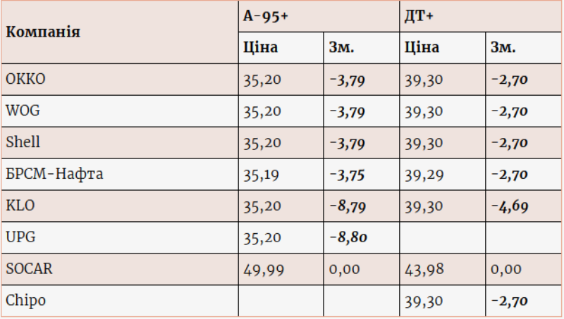 Як повідомляє encorr, на заправних станціях WOG та ОККО бензин марки А-95 подешевшав на 3,79 гривні за 1 літр (до 35,20 грн), а дизельне паливо – на 2,7 грн/л (до 39,30 грн) . Мережі Shell, KLO, UPG, Chipo та БРСМ також знизили вартість преміального пального. А ось мережа SOCAR поки що не відреагувала на внесені Кабміном зміни.