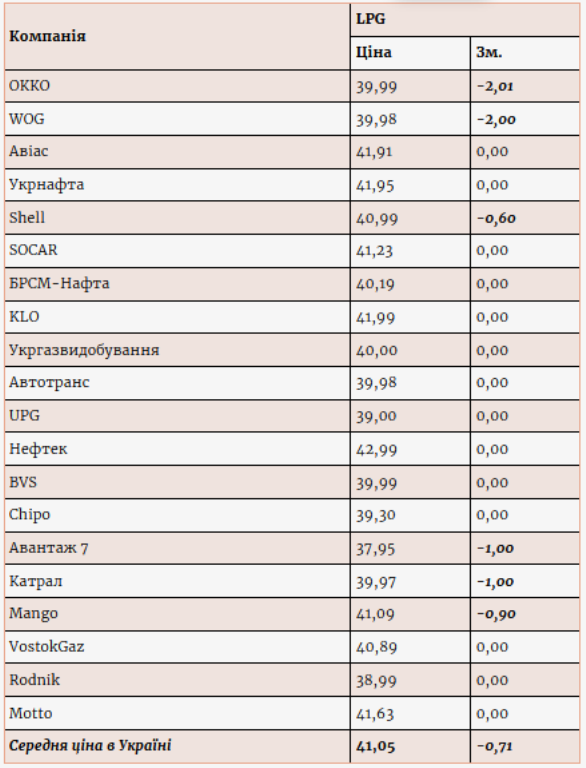 Також значно подешевшав цей продукт на заправках «Авантаж» (-1 грн), «Катрал» (-1 грн), «Mango» (-0,9 грн) і Shell (-0,6 грн). За підсумком середня вартість скрапленого газу в Україні становить 41,05 гривні за літр.