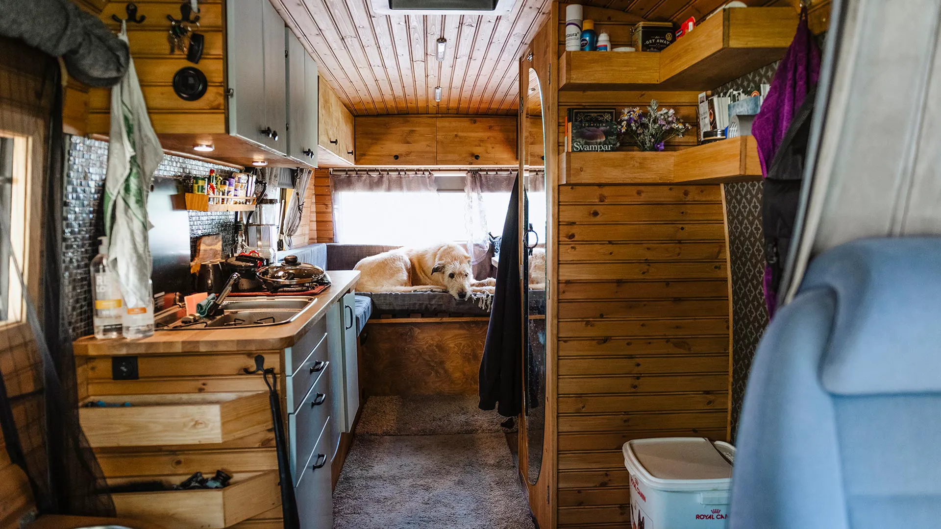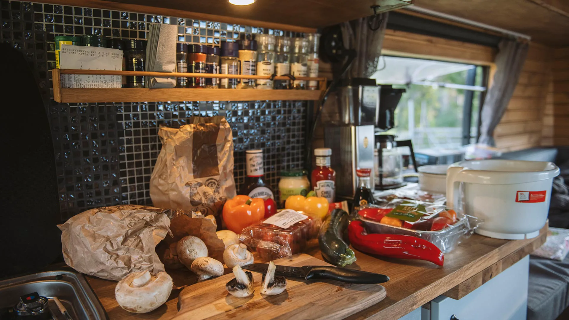 А для себя Катя и Бьорн встроили классную кухню – с 80-литровым холодильником на солнечной энергии, комбинированной раковиной/плитой с двумя конфорками (и изящной крышкой, чтобы при необходимости было больше полезного места на столе), а также достаточным пространством для хранения продуктов