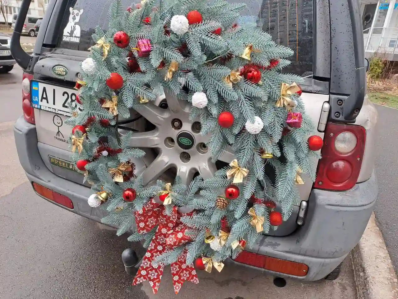 А вся справа в запасному колесі на задніх дверях. Воно майстерно прикрашене ялинковими гілочками з різноманітними іграшками та мега популярними новорічними бантиками. Що й казати, їхати за таким авто одне задоволення.