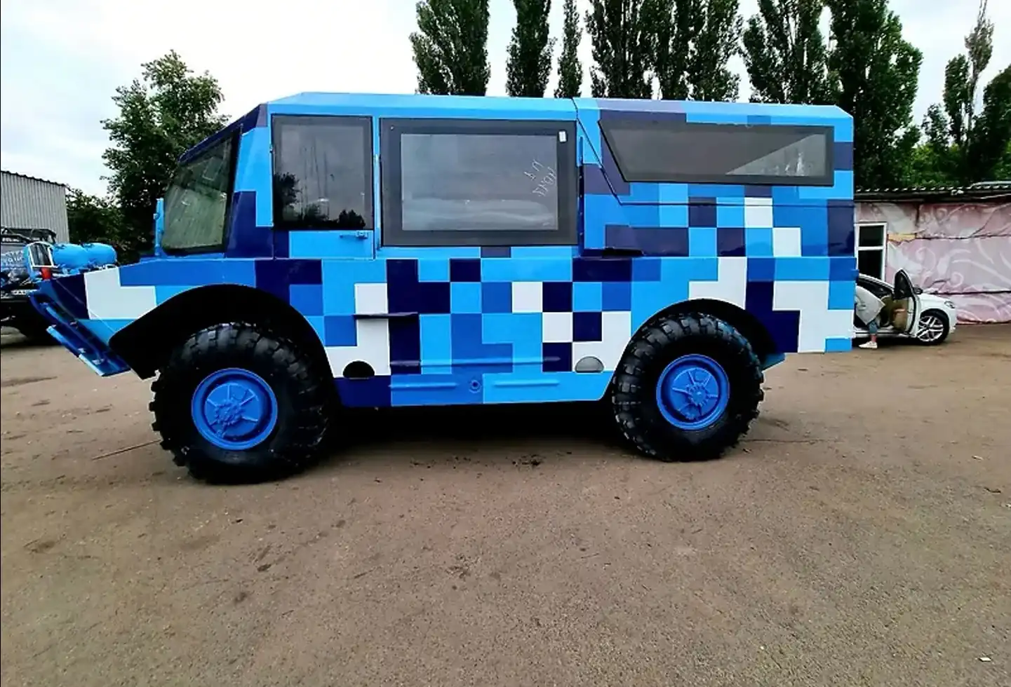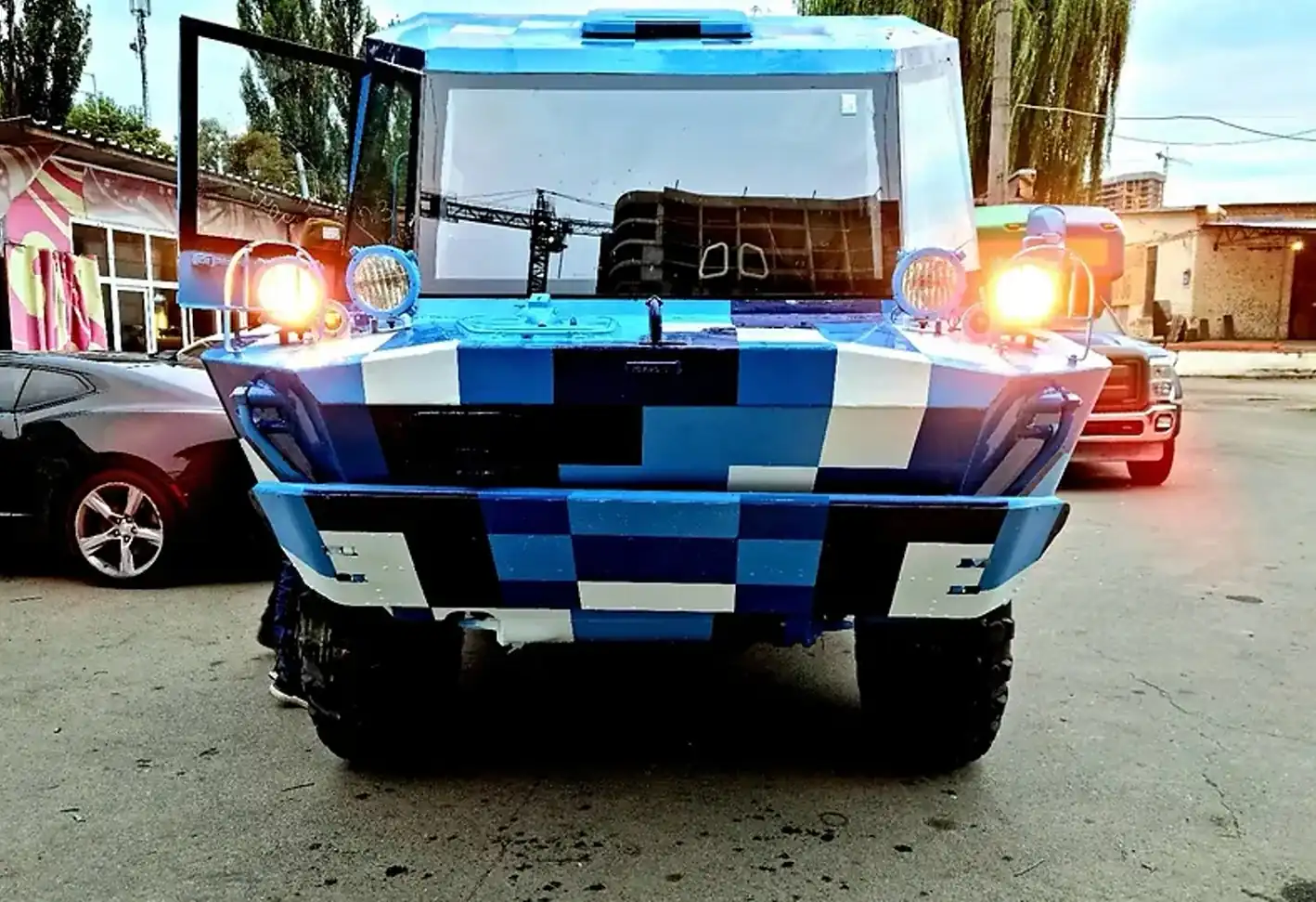 Цікаво, що місце водія і переднього пасажира прикрашають спортивні ковшоподібні крісла а-ля Recaro. Люксовий БРДМ- 2 має також незвичайний камуфляжний колір у вигляді синьо-біло-блакитних кубиків, що робить його малопомітним серед міського пейзажу.
