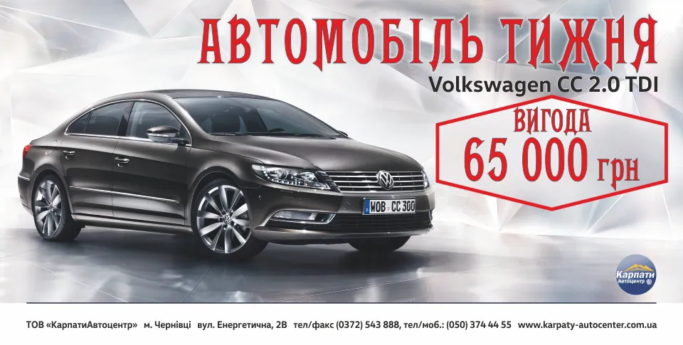 Дізнайтеся деталі пропозиції тижня в автосалоні «КарпатиАвтоцентр» за адресою м.Чернівці, вул.Енергетична 2-В, тел. (0372) 543 888, 096 374 44 55.