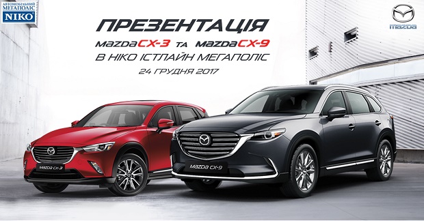 «НИКО Истлайн Мегаполис» презентует новые долгожданные модели Mazda СХ-3 и Mazda CX-9. Презентация будет проходить 24 декабря 2017 года с 11:00 в автосалоне Mazda «НИКО Истлайн Мегаполис» по адресу: Бориспольское шоссе, 13 км.
