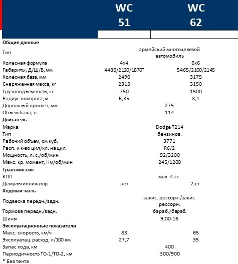 Ще 1939 року американська компанія Dodge почала випускати для армії повнопривідні автомобілі вантажопідйомністю 1/2 тонни. У це сімейство, що отримало назву VC, входили пікап, 7-місний пасажирський фургон і відкрита командирська машина. Об'єм двигуна становив 3,3 л, потужність – 75 л. с.Втім, таких військових автомобілів було виготовлено порівняно небагато – лише 4600 штук. Вже 1941 року розпочалося виробництво досконалішої серії – WC. На відміну від попередньої, де використовувалися обтічні капот і крила від комерційних машин, вона набула простих і лаконічних форм. Фари та плоский радіатор були захищені ґратами у разі зіткнення з перешкодами. Під простими Г-подібними крилами не скупчувався бруд. Потужний рейкоподібний передній бампер і два задні буфери дозволяли виштовхувати однотипні машини у разі їх застрягання. Робочий об'єм двигуна зріс до 3,8 л, потужність – до 92 к. с.
