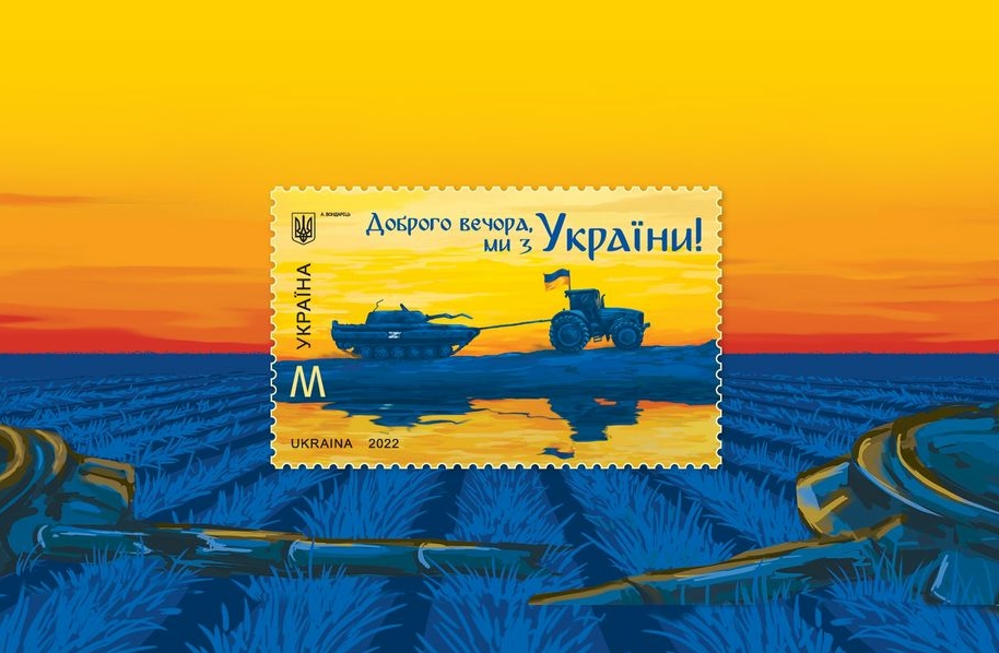 Сьогодні, 28 липня в День Української Державності у світ вийшла чергова марка Укрпошти, присвячена героїчній боротьбі нашого народу з російськими окупантами. Вона називається «Доброго вечора, ми з України!». На ній зображено колісний трактор, що тягне за собою підбиту ворожу БМП.