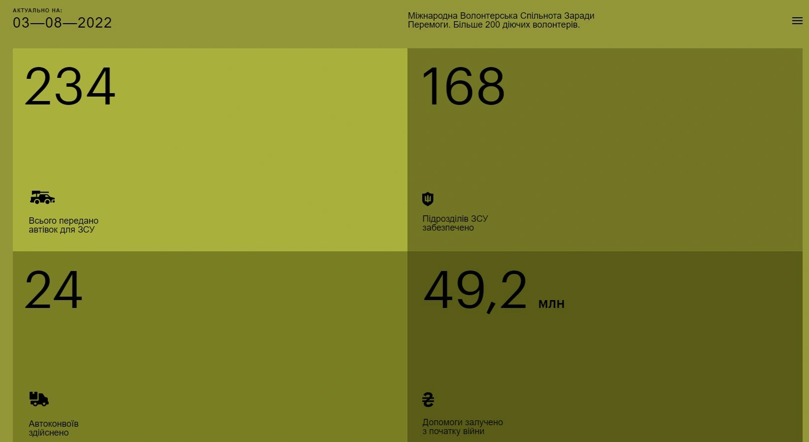 О. П.: Перші машини я возив власним коштом. Якби не почалось вторгнення, за тиждень ми з сім’єю мали купувати квартиру. Ось ці гроші я і використав на придбання машин. Почав шукати «швидкі», тому що нам їх не вистачає. Почались обстріли, поранені… А вже потім перейшов на пікапи та позашляховики, тому що сформувалась ціль – допомогти спецпідрозділам. Тоді ще не було лінії фронту, а було тільки розуміння, що саме «спецура» перебуває на вістрі боротьби, тож саме вони потребують підтримки. Тому перші пікапи та позашляховики були надані ССО Нацполіції, ССО ЗСУ, Альфа СБУ… Тобто найбільш лютим нашим хлопцям і дівчатам.