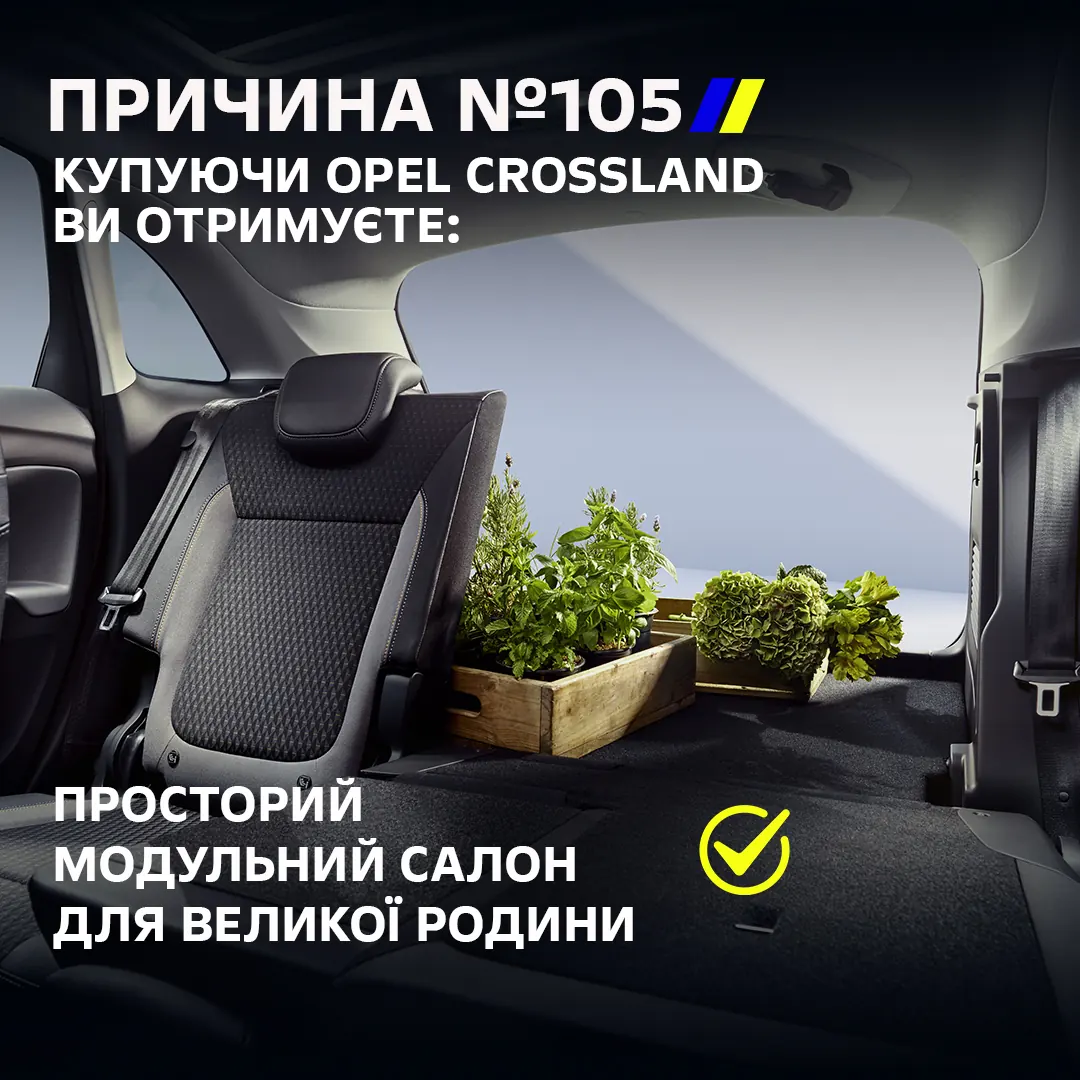 Незважаючи на компактні розміри (довжина 4,22 м та ширина 1,77 м), що забезпечують автомобілю Opel Crossland легкість маневрування на тісних міських вулицях, цей кросовер все одно пропонує дуже просторий та зручний салон для родини. Все завдяки тому, що внутрішній простір Opel Crossland скомпоновано модульним методом для досягнення максимальної практичності. Наприклад, спинка заднього сидіння розділена в пропорції 40/60 – це дозволяє скласти лише одну з її частин: так можна залишити місце для пасажира позаду та, водночас, розмістити доволі габаритний вантаж.Ще однією особливістю Opel Crossland є його чимала висота (майже 1,61 м) та, відповідно, доволі високі й великі дверцята: вони забезпечують чудовий доступ пасажирів в салон або легкість встановлення дитячого крісла. Нарешті, варто відзначити місткий 410-літровий багажник з можливостями збільшення за умови складання заднього сидіння та відмінним доступом через широкі задні дверцята.