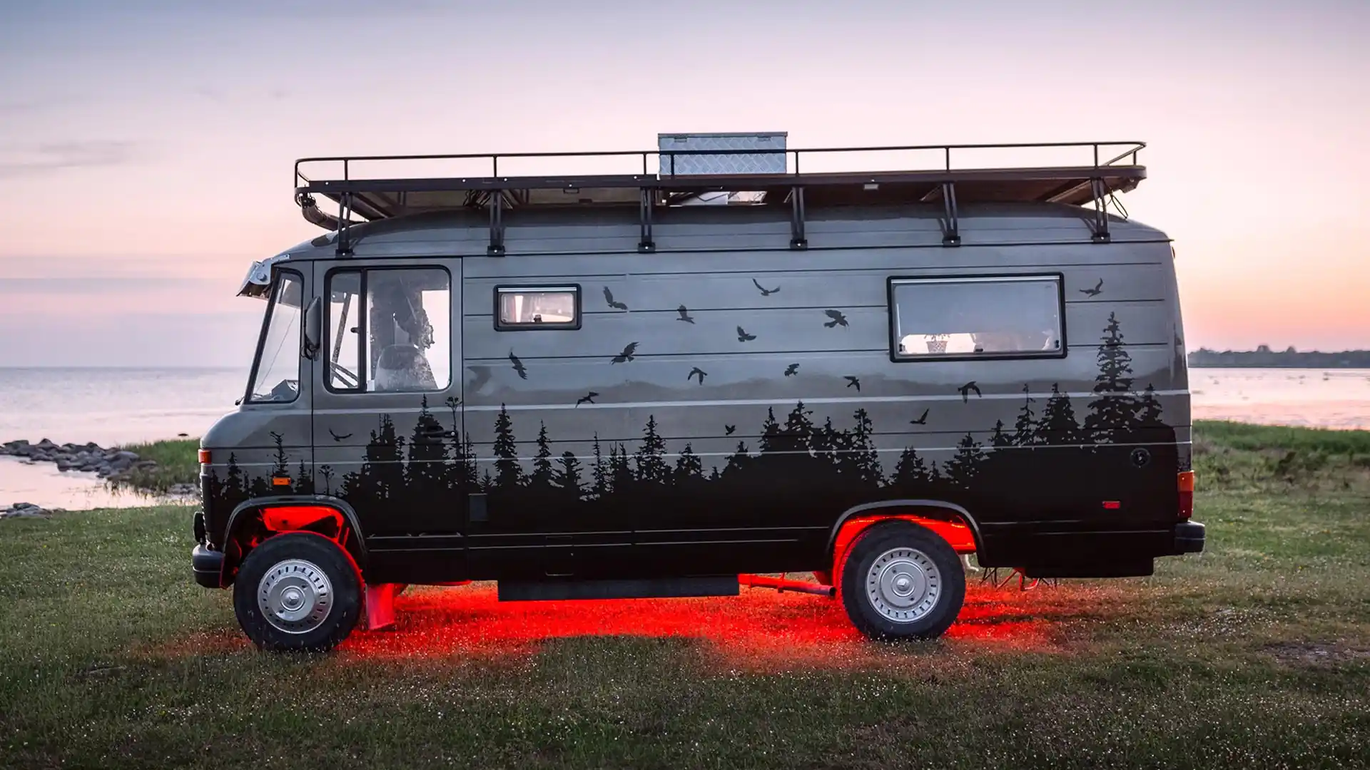 Особое внимание было уделено внешнему оформлению кемпера. Прежде всего отметим отличную работу по аэрографии - в виде пейзажа со стаей кружащих птиц. А в темное время суток фургон Mercedes-Benz 508D зачаровывает своей светодиодной подсветкой красного цвета, излучаемой из-под днища, что в холодные зимние вечера визуально согревает.