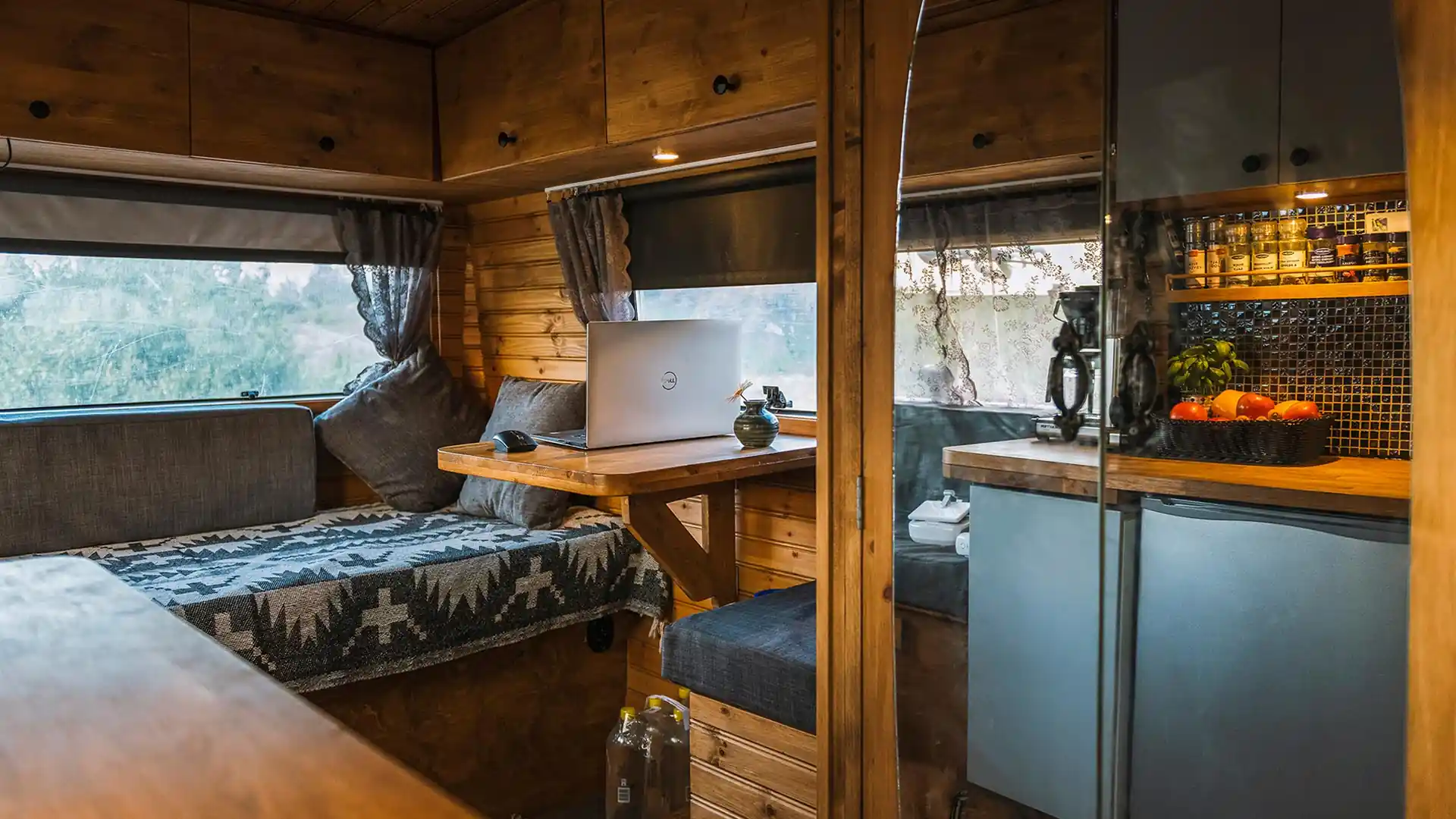 У них также есть полноценный угловой диван с емким вещевым отсеком. Несмотря на то, что во многих кемперах, переделанных из фургонов, есть стационарная кровать, Кате и Бьорну не понравилась идея тратить на это столько полезного пространства. Вместо этого угловой диван с помощью выдвижной конструкции легко трансформировать в полноценную двуспальную кровать.