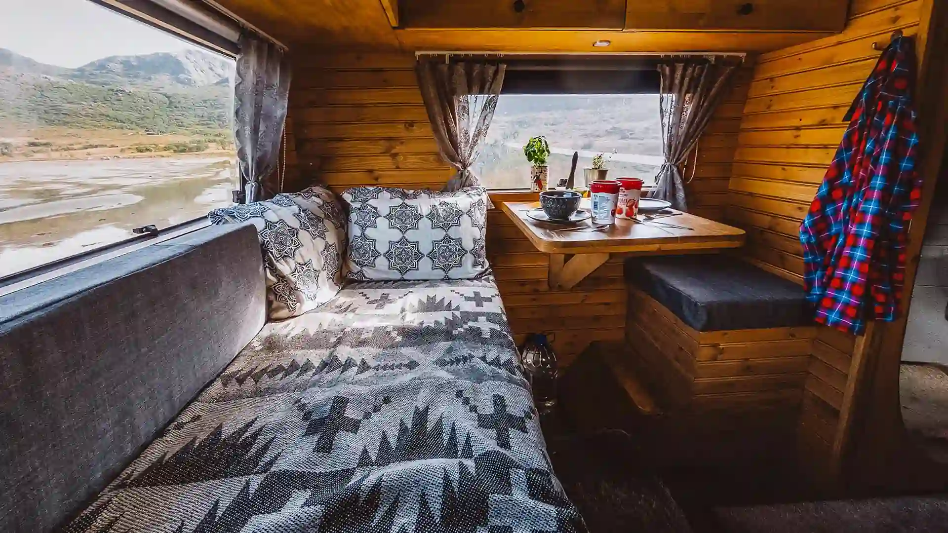 В задней части фургона находится обеденная зона с сиденьми и раскладным столом для еды и работы. Бьорн планирует в будущем поменять стол на что-то большее, но на данный момент этого более чем достаточно для пары.
