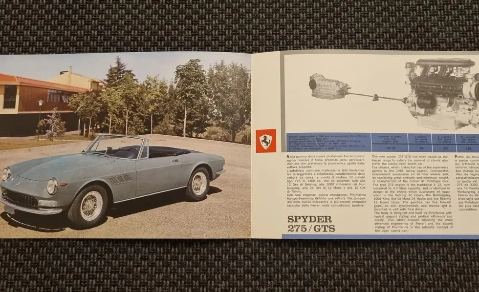 Первый в списке — четыре печатных каталога Ferrari середины1960-х годов к гран-туреру Ferrari 275 в версиях 275GTB, 275GTB4 и 275GTS. Лот включает руководство по эксплуатации и обслуживанию, два каталога запасных частей и рекламную брошюру 275GTS на итальянском, французском и английском языках. Упакованы они в обтянутый тканью чехол с логотипом Ferrari и кожаным язычком на застежке. За четыре дня до конца аукциона текущая ставка лота составляла 650 долларов.