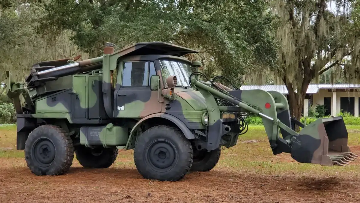 Еще один интересный экземпляр — военная инженерная машина Freightliner Unimog со съемным фронтальным погрузчиком с гидравлическим приводом. Автомобиль использовался армией США и до сих пор окрашен в камуфляж.