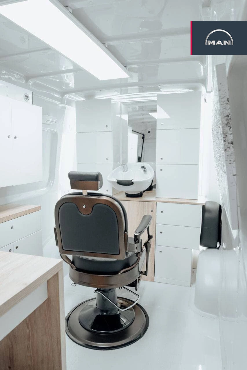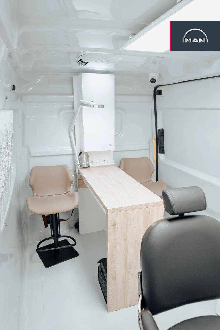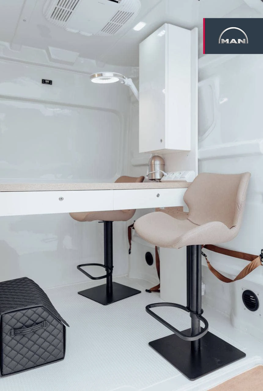Это первый мобильный салон красоты Mobbea, который создали прямо в развозном фургоне MAN TGE 3.140. Для этого использовали один из самых вместительных