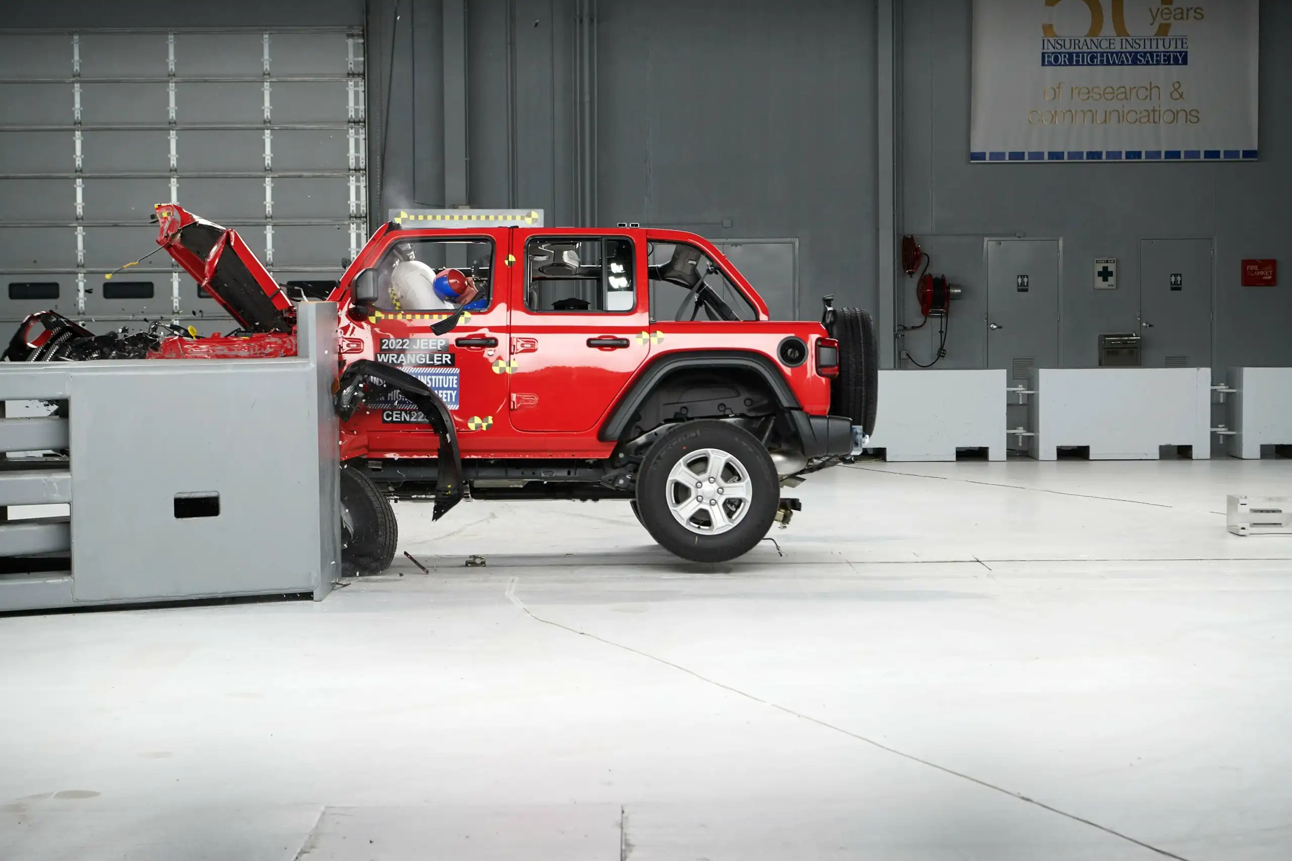 Американский институт дорожный безопасности (IIHS) опубликовал видео очередного неудачного краш-теста внедорожника Jeep Wrangler. Автомобиль не устоял во время удара о препятствие с небольшим перекрытием со стороны водителя.