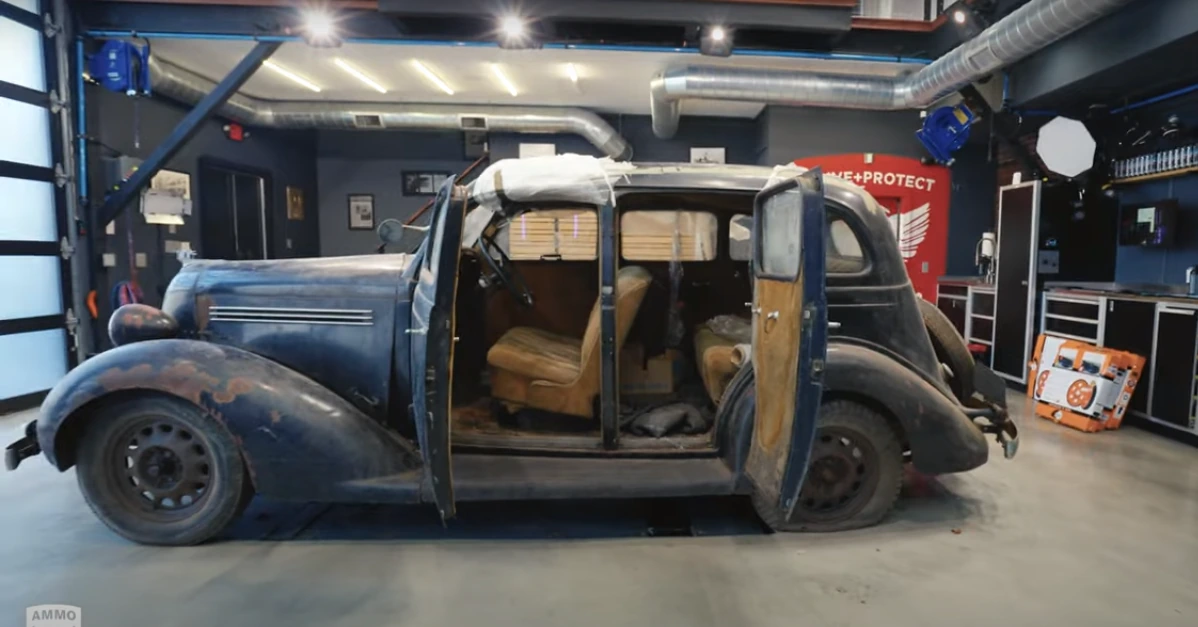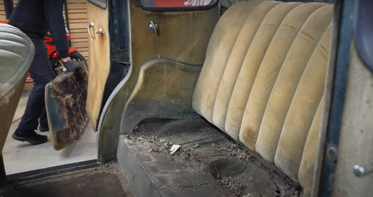 Классический довоенный седан находится в довольно плачевном состоянии. Его кузов сильно проржавел, а салон долгие годы был домом для грызунов. О количестве пыли и паутины и вовсе говорить не приходится. Ее здесь огромное количество. Она присутствует везде, включая подкапотное пространство. Также от долгого простоя пришли в негодность все уплотнители, резиновые патрубки и прочее.