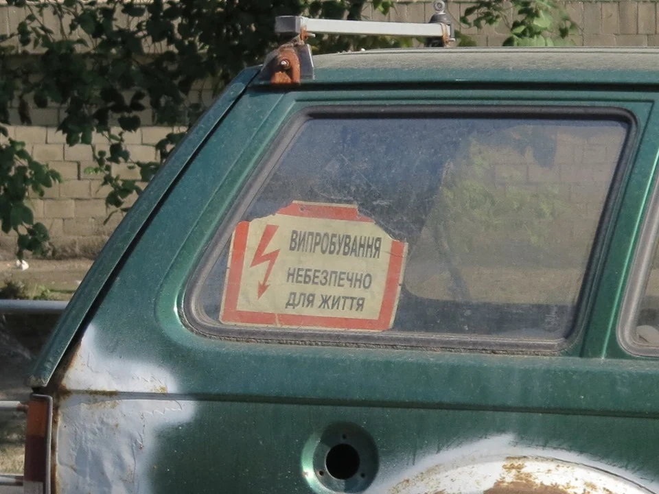 Во-первых, эта машина раннего выпуска – так как имеет круглые фары, а не прямоугольные. Внимание привлекают широко расставленные колеса с шинами, которые уже изрядно спущены и вросли в асфальт. И третья особенность данного экземпляра – очень колоритная табличка за стеклом багажного отсека – с надписью «Випробування небезпечно для життя».
