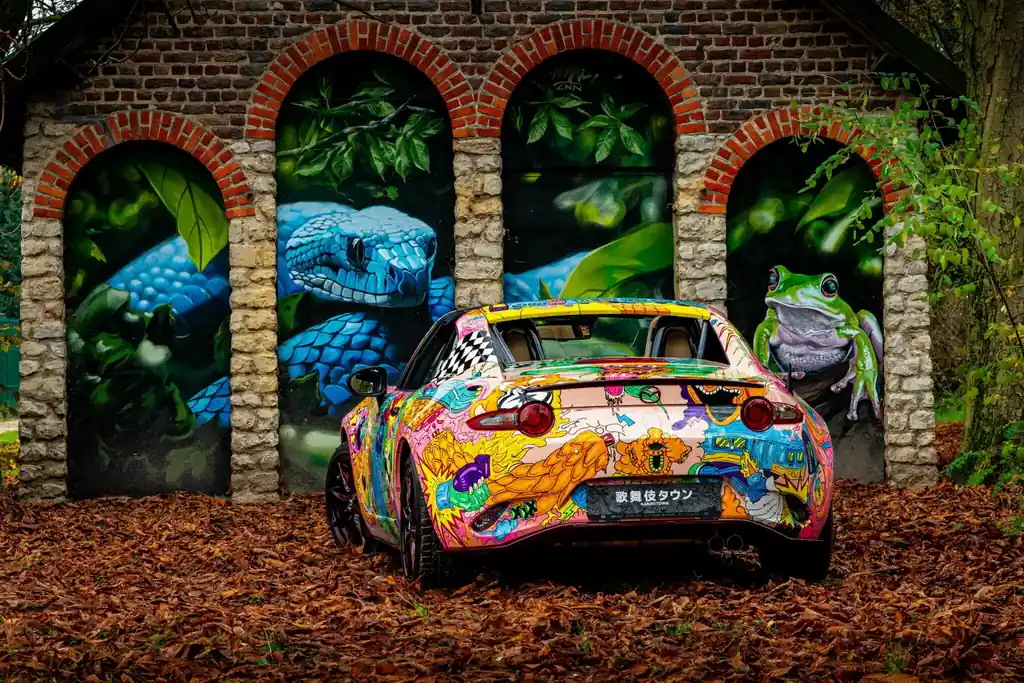 На создание этого уникального купе-кабриолета Mazda MX-5 Kabuki Town ушло свыше 500 часов ручного труда. Автомобиль отправится в 6-месячный рекламный тур, а затем будет продан ценителю современного искусства. Необычный автомобиль стал результатом коллаборации бельгийского дилера Mazda St-Michel и местной компанией Gisele Racing.